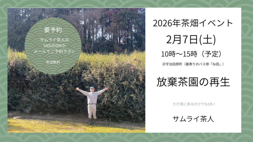 2026年2月7日(土)10時から15時、宇治田原町のサムライ茶人の茶畑でイベントをします(予約必要)。