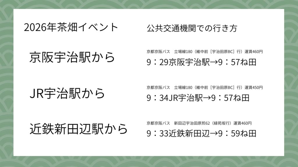 人数に限りがありますが、10時に近鉄新田辺駅まで来られたら送迎いたします。